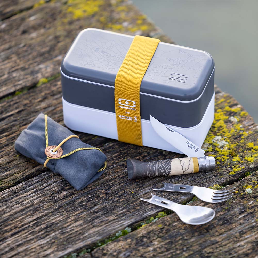 An exclusive collaboration between Opinel and monbento, the on-the-go meal kit features the MB Original Outdoor Lunch Box, a limited edition No.08 Folding Knife, and the Picnic+ insert set (fork and spoon) with a microfiber napkin in a fresh colorway - anthracite and mustard.