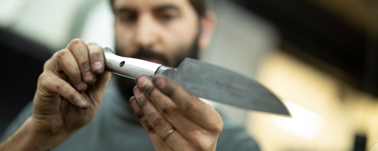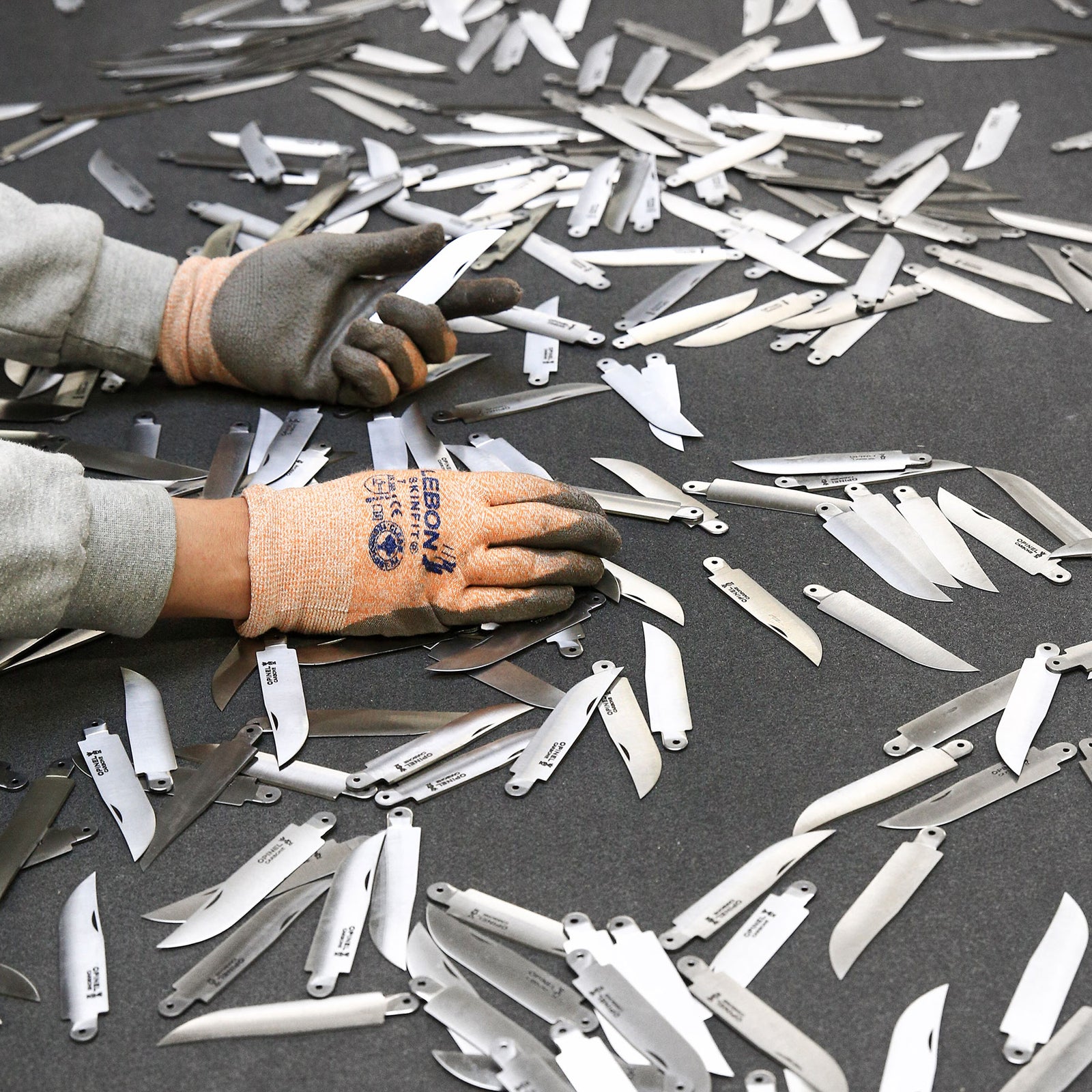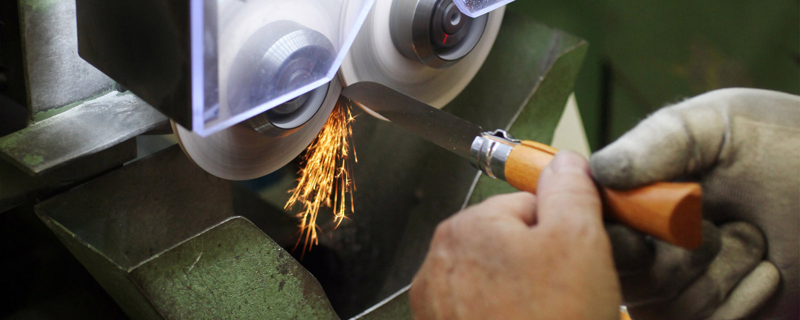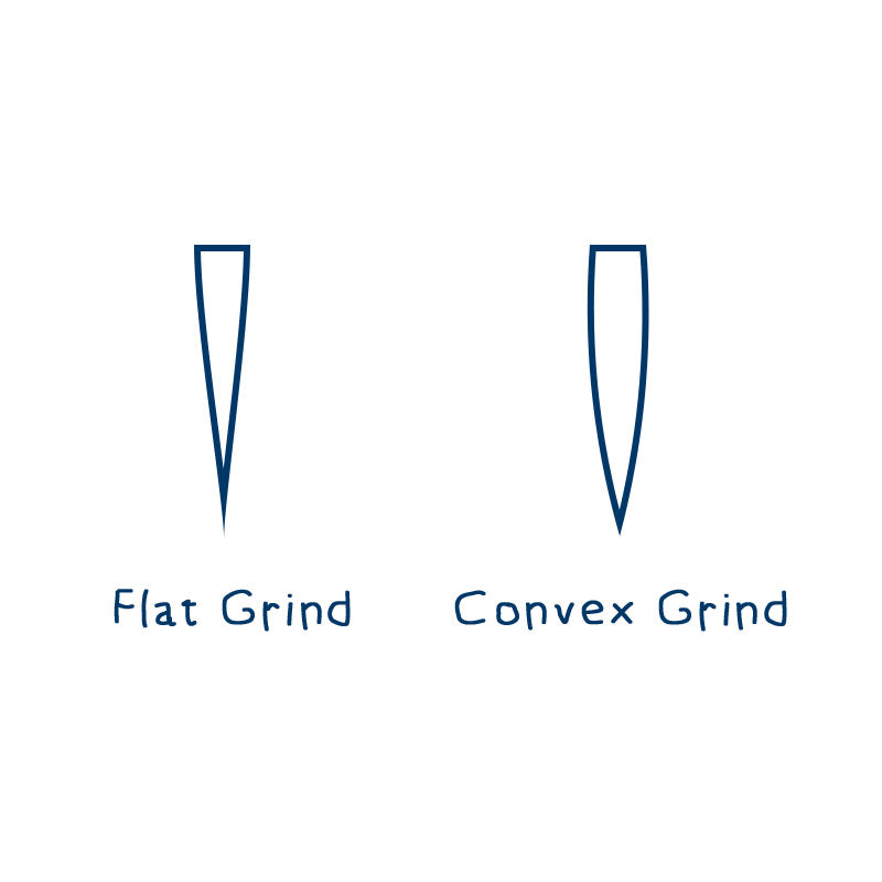 Our blades are sharpened to be convex rather than a standard flat grind. Convex-sharpened blades have more material towards the leading edge of the blade which improves overall cut quality, but also durability. This method is what gives our folding knives their signature "Opinel sharpness."