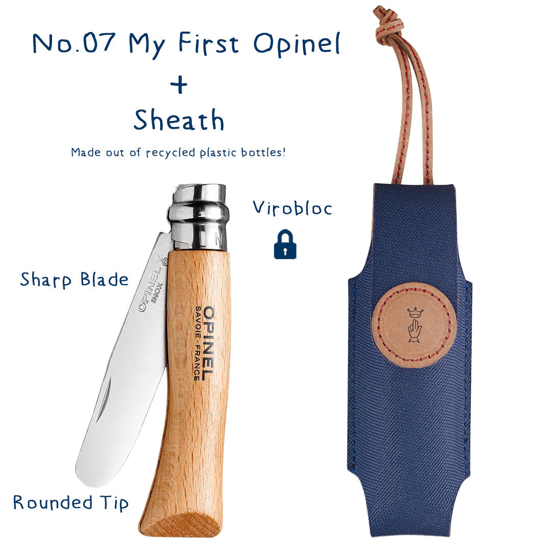 The No.07 My First Opinel with Sheath is the perfect knife to teach kids how to whittle, cut, prune or carve wood. The sheath is made from recycled material and will stand the test of time. The knife has a stainless steel blade making it easy to maintain and take care of. The folding knife also features our patented Virobloc locking mechanism which keeps the blade safely closed for transport or securely open while in use. We suggest adult supervision when teaching kids to use the knife.